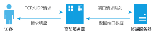 针对其他用户,主要采用端口转发方式,使端口请求经过高防服务器进行请求过滤,然后映射到终端服务器进行数据交换。