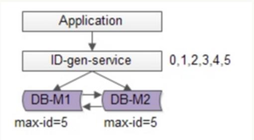 由两个数据库服务器生成ID,设置不同的auto_increment值。第一台sequence的起始值为1,每次步长增长2,另一台的sequence起始值为2,每次步长增长也是2。结果第一台生成的ID都是奇数(1, 3, 5, 7 ...),第二台生成的ID都是偶数(2, 4, 6, 8 ...)。