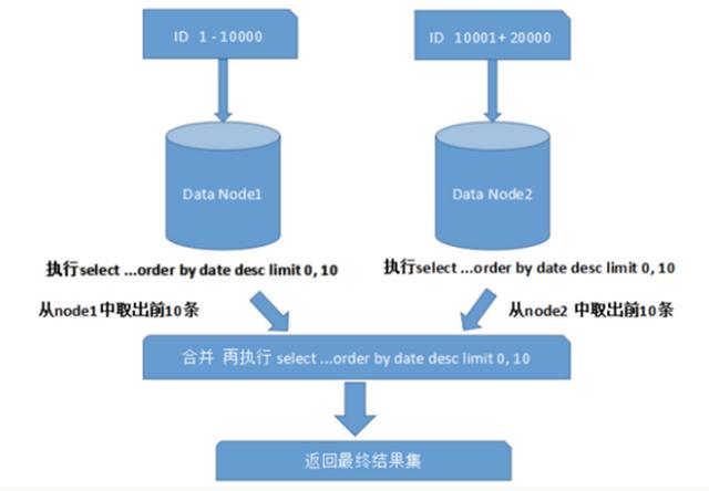 跨节点多库进行查询时,会出现limit分页、order by排序等问题。分页需要按照指定字段进行排序,当排序字段就是分片字段时,通过分片规则就比较容易定位到指定的分片;当排序字段非分片字段时,就变得比较复杂了。需要先在不同的分片节点中将数据进行排序并返回,然后将不同分片返回的结果集进行汇总和再次排序,最终返回给用户。如图所示: