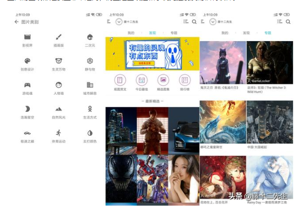 图片的类别分为:影视界、插画版、二次元、创意设计、生灵万物、静与物、游戏魂、人物墙、城市瞬息、浩瀚星空、自然风光、生活方式、极速之巅、体育运动、主打颜色。
