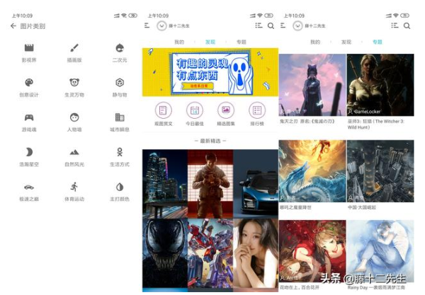 同时,在它的版块上,还给我们详细分类:观赏图文、今日最佳、精选图集和排行榜,在这些大分类里面还有一些小分类。