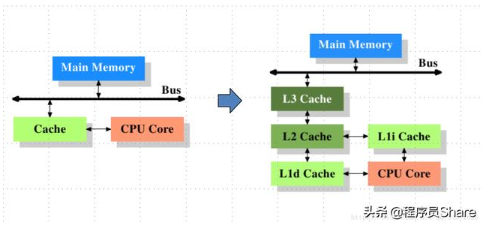 上述左图是最简单的高速缓存的图示,数据的读取和存储都经过高速缓存,CPU核心和高速缓存之间有一条特殊的快速通道,在这个简化的图示上,主存(main memory)与高速缓存(cache)都连在系统总线上。这条总线同时还用于其他组件之间的通信。在高速缓存出现后不久,系统变得更加复杂,高速缓存与主存之间的速度差异被拉大,直到加入了另一级的缓存(由于加大一级缓存的做法从经济上考虑是行不通的,所以有了二级缓存甚至三级缓存)。新加入的这些缓存比第一缓存更大但是更慢。