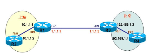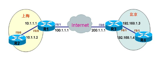 在上图中,由于上海和北京的两个分公司内部网络分别使用了私有 IP 网段10.1.1.0 和 192.168.1.0,而私有 IP 网段是不能传递到 Internet 上进行路由的,所以两个分公司无法直接通过私网地址 10.1.1.0 和 192.168.1.0 互访,如 R2 无法直接通过访问私网地址 192.168.1.4 来访问 R4。在正常情况下,上图中两个分公司要互访,可以在连接 Internet 的边界路由器上配置 NAT 来将私网地址转换为公网地址,从而实现两个私有网络的互访。