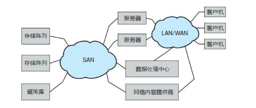 SAN提供了一种与现有LAN连接的简易方法,并且通过同一物理通道支持广泛使用的SCSI和IP协议。SAN不受现今主流的、基于SCSI存储结构的布局限制。特别重要的是,随着存储容量的爆炸性增长,SAN允许企业独立地增加它们的存储容量。