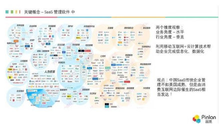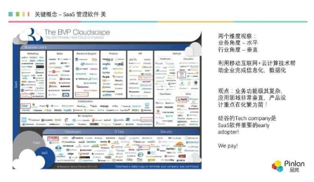 如图,这是 BVP 研究机构做的关于云计算领域的整个情况,分为 SaaS、PaaS 和 IaaS。今天主要分享企业管理软件 SaaS。具体可从两个维度分析: