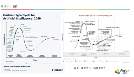 再看聊天机器人,AutoML 等公司都处于最高处,都在自动建模。还有在上升阶段的 Neuromorphic Hardware,是一个新型的芯片,它是用神经拟态在做计算,不需要走传统 x86 的框架,就可以直接提供更高阶的 AI 模型的建模能力。