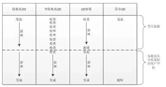 I/O操作分为两个阶段:第一个阶段等待数据可用,第二个阶段将数据从内核复制到用户空间。