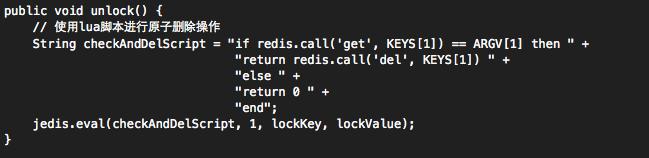 这些解决方式的目的都是要确保i++ 操作的原子性。那么回过头来看看解锁,同理我们也是要确保解锁的原子性。我们可以利用Redis的lua脚本来实现解锁操作的原子性。