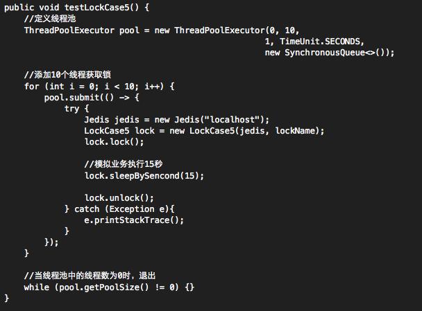 版本5的完整代码:Github地址:https://link.juejin.im/?target=https%3A%2F%2Fgithub.com%2Frainbowda%2FlearnWay%2Fblob%2Fmaster%2FlearnRedis%2Fdistributed-locks%2Fsrc%2Fmain%2Fjava%2Fcom%2FlearnRedis%2Flock%2Fcase5%2FLockCase5.java