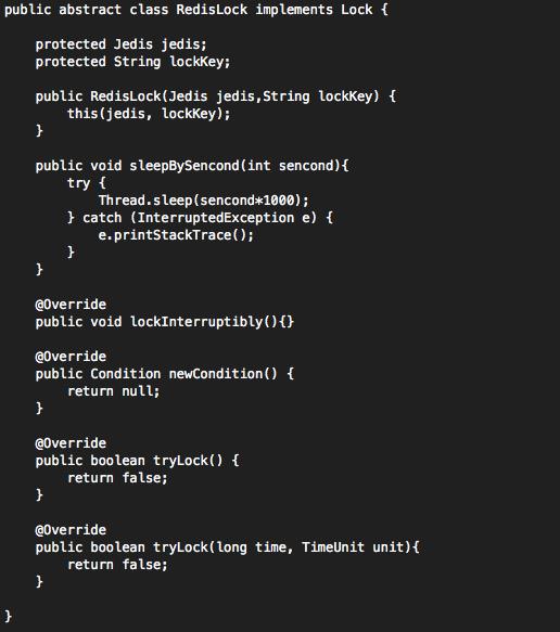 抽象类RedisLock实现java.util.concurrent包下的Lock接口,然后对一些方法提供默认实现,子类只需实现lock方法和unlock方法即可。代码如下