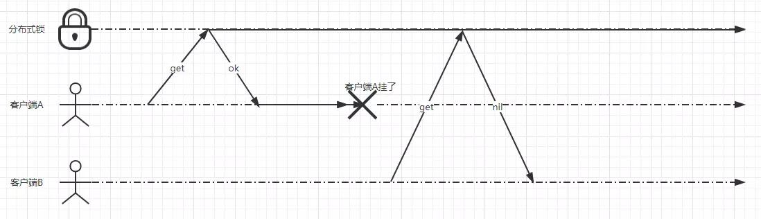 假设有两个客户端A和B,A获取到分布式的锁。A执行了一会,突然A所在的服务器断电了(或者其他什么的),也就是客户端A挂了。这时出现一个问题,这个锁一直存在,且不会被释放,其他客户端永远获取不到锁。如下示意图