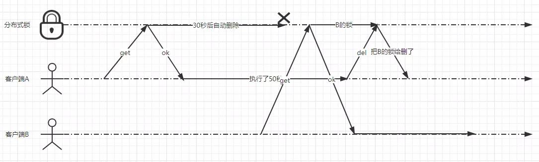 客户端A从阻塞中恢复过来,释放掉了客户端B持有的锁。