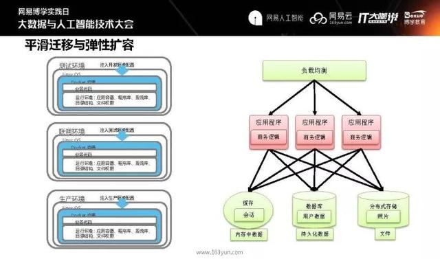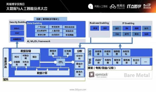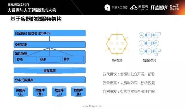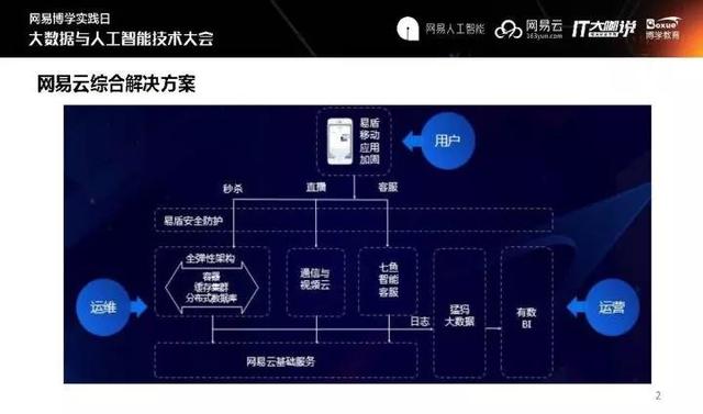 对于IT架构来讲,我们通过基础服务,提供基础的计算、网络、存储等资源。对于业务架构方面,可以基于基础服务部署全弹性的架构,这个架构有很多最佳实践,例如考拉,云音乐,云课堂等。如果大家想做直播,通信与视频云只要一天就能够接入。对于数据架构,我们有两个产品,一个是猛犸大数据,一个是有数BI。人工智能有七鱼和易盾两个产品。