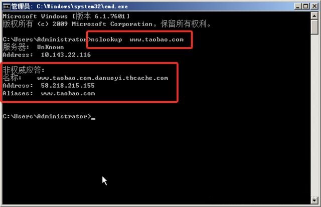 输入:“nslookup 要检测的域名”,查看结果。