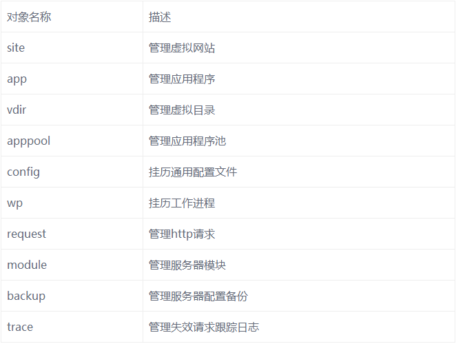 1.appcmd提供一组操作IIS操作对象,如下表: