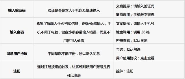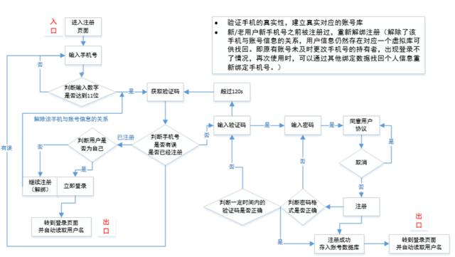 解决账号真实性和唯一性,以及用户新手机号被注册过后解绑注册问题,保证用户注册顺畅,以便用户可以快速获取自己想要的服务。其中注册模块功能点包括手机号,手机验证码,密码,用户协议及注册。其重点在于通过业务逻辑保证体系的完善性,通过优化用户使用流程及交互体验来是产品变得易用性,提高用户的转化率。