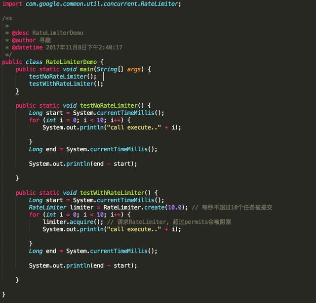 我看到了网上使用guava提供了限流工具类RateLimiter提供了限流工具类RateLimiter,所以这里写个简单的demo,该类基于“令牌桶算法”,非常方便使用。该类的接口描述请参考:RateLimiter接口描述,具体的使用请参考:RateLimiter使用实践。