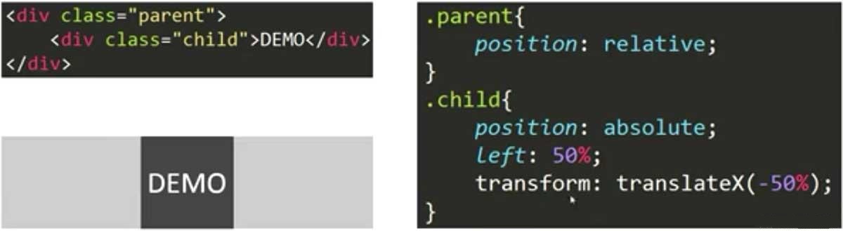 缺点:兼容性问题;(relative + relative) => 父元素设置 relative 向右平移 50%, 子元素设置 relative 向左平移 -50%,relative 均是相对于自身宽度进行移动;