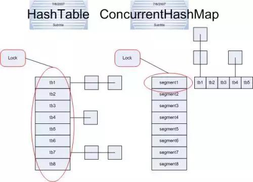 ConcurrentHashMap和Hashtable主要区别就是围绕着锁的粒度进行区别以及如何区锁定。