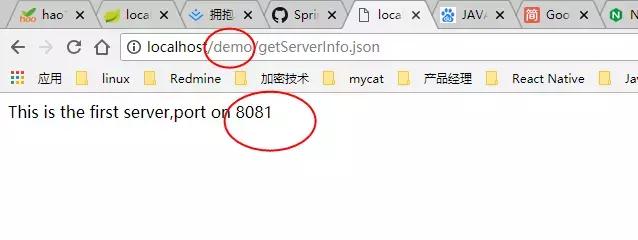 http://xxxx:port/demo/getServerInfo.json进行转发,结果正确。如果proxy_pass配置为http://xxxx:port/demo1,则会使用http://xxxx:port/demo1进行转发,因为/demo1覆盖了/demo。