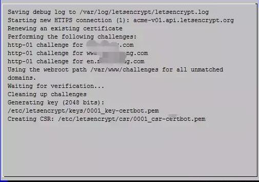 获取证书过程中Let’s encrypt需要验证用户对域名的所有权,根据提示操作即可。
