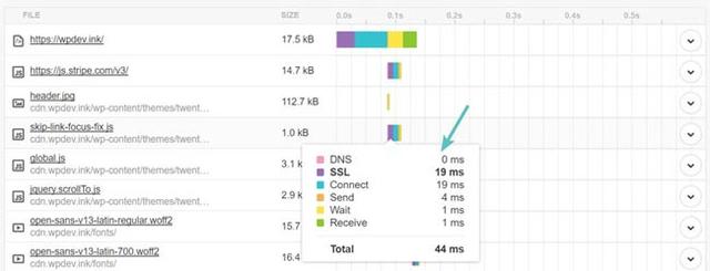 这种DNS查找会导致额外的加载时间,因为在DNS查询完成之前,无法加载任何内容。注意下面的一个CDN URL上的DNS查询超过了300毫秒。这不包括在wpdev.ink或js.stripe.com上的查找。所以你可以看到随着时间的推移,这可以加起来。