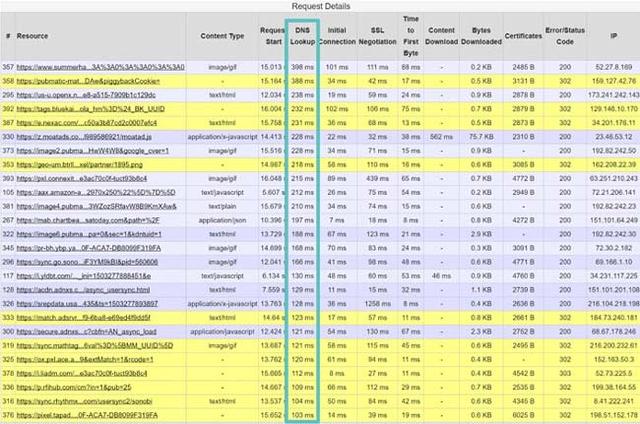 这是一个使用WebPageTest的例子。他们实际上可以快速查看您的请求详细信息,您可以在其中单击“DNS查找”列并按最高响应时间对其进行排序。我们通过该工具运行usatoday.com作为例子,单单DNS查询时间花了6.5秒!