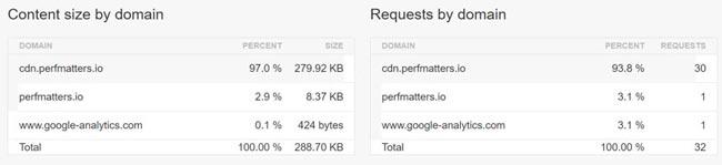 减少DNS查询的最简单方法之一是将尽可能多的资源移动到您的CDN提供商。如果您通过Pingdom运行您的网站,则可以按域查看请求的总数。正如你在这个例子中看到的,93.8%的请求是到CDN URL的。向主机发送一个请求,向Google Analytics发送一个请求。通过将尽可能多的资源移动到CDN,这减少了涉及的DNS查找次数,因此减少了加载时间。