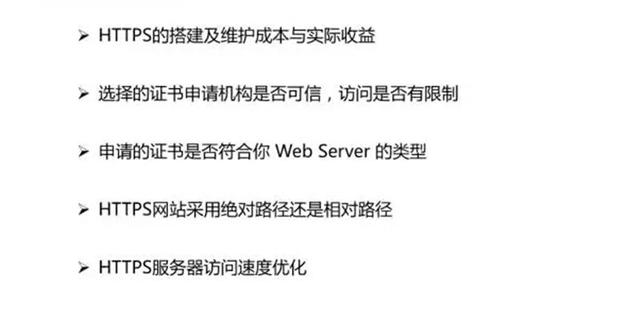 无论是做一个新的HTTPS站还是从HTTP转成HTTPS的网站,都需要投入硬件、软件、人力等新的成本,所以在未评估之前建议不要做;一旦做好,轻易不要关闭HTTPS网站倒退回HTTP,这种倒退行为很容易造成不利影响;