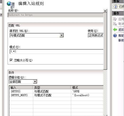 15、填写规则名称:Redirect to https,使用正规表达式,模式填写 (.*),然后接下来选择添加条件。第一个填{HTTPS} 与模式匹配 ^OFF$ ,第二个填{HTTPS_HOST} 与模式不匹配 ^(localhost) 。