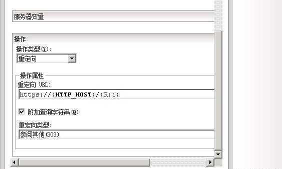 16、操作类型选择重定向,然后选择属性为https://{HTTP_HOST}/{R:1} 重定向类型选择303。