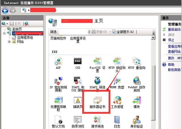 6、然后打开IIS的主页找到服务器证书栏,双击打开即可。