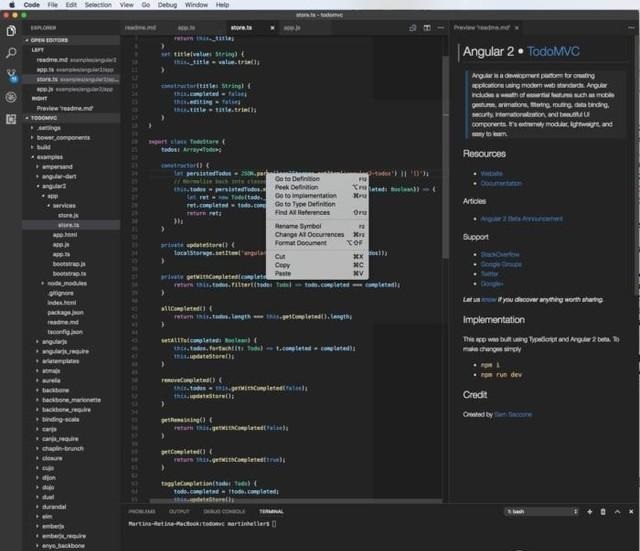 Visual Studio Code是一个免费的轻量级编辑器和来自Microsoft的IDE。它具有Visual Studio的组件,与开源的Atom Electron shell混合,为使用C#的ASP.Net Core开发提供了极好的支持,并通过TypeScript和JavaScript为Node.js开发提供了极好的支持。利用Microsoft在Windows上仅支持Visual Studio的历史模式,Visual Studio Code也在MacOS和Linux上运行。下面的截图是在MacOS上的截图。