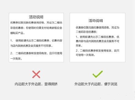 内边距尽量不要大于外边距。外边距大于内边距时,有适当的留白,用户的视线不受干扰,更专注于内容本身