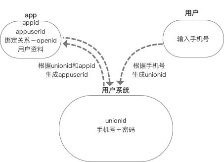 1)手机号作为用户系统账号的注册的唯一途径,根据手机号在用户系统服务端创建并保存unionid;app服务端根据unionid创建并保存appuserid,且将unionid对应保存;