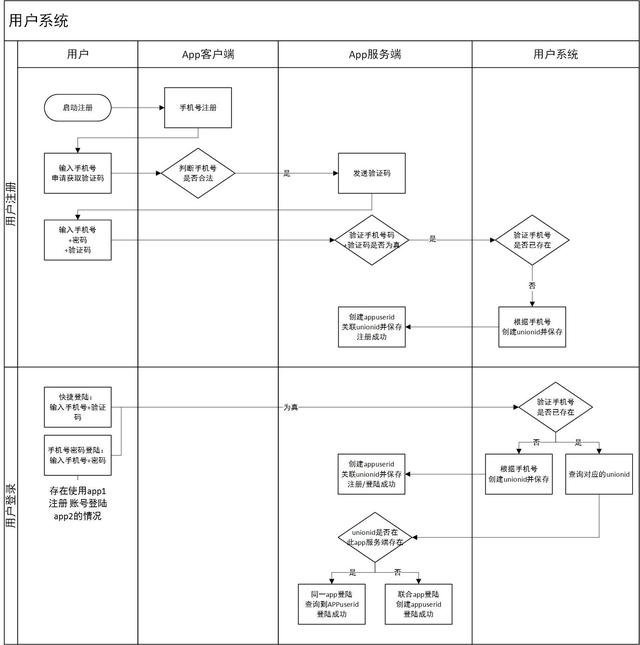 用户注册时,用户系统服务端需要验证手机号+验证码是否为真,此手机号是否已有对应unionid;若有提示已注册,请登录;若无创建对应unionid,app服务端根据unionid创建appuserid。至此成功生成了用户系统身份及当前app用户身份。