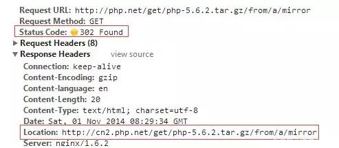 当用户发来请求的时候,Web服务器通过修改HTTP响应头中的Location标记来返回一个新的url,然后浏览器再继续请求这个新url,实际上就是页面重定向。通过重定向,来达到“负载均衡”的目标。例如,我们在下载PHP源码包的时候,点击下载链接时,为了解决不同国家和地域下载速度的问题,它会返回一个离我们近的下载地址。重定向的HTTP返回码是302,如下图: