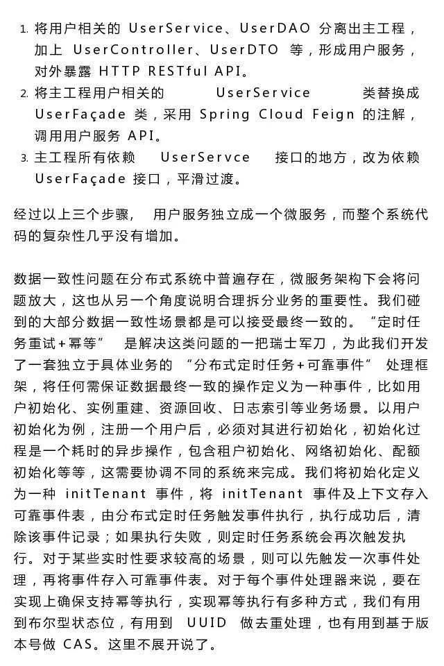 服务拆分的好坏直接影响了实施微服务架构的收益大小。服务拆分的难点往往在于业务边界不清晰、历史遗留系统改造难、数据一致性问题、康威定律等。从我们经验来看,对于前两个问题解决思路是一样的:1)只拆有确定边界能独立的业务。2)服务拆分本质上是数据模型的拆分,上层应用经得起倒腾,底层数据模型经不起倒腾。对于边界模糊的业务,即使要拆,只拆应用不拆数据库。