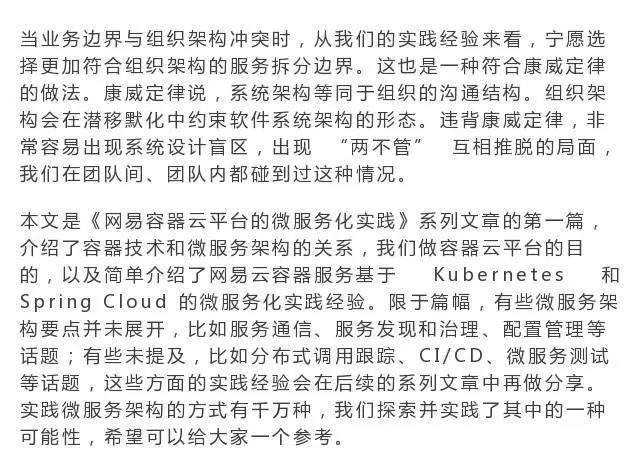 一旦决定做微服务架构,有很多现实问题摆在面前,比如技术选型、业务拆分问题、高可用、服务通信、服务发现和治理、集群容错、配置管理、数据一致性问题、康威定律、分布式调用跟踪、CI/CD、微服务测试,以及调度和部署等等,这并非一些简单招数能够化解。实践微服务架构的方式有千万种,我们探索并实践了其中的一种可能性,希望可以给大家一个参考。本文是《网易容器云平台的微服务化实践》系列文章的第一篇。