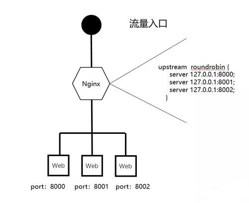 配置真实提供服务的 Web 应用 IP 和端口,和负载均衡策略。上图中的配置是 Nginx 中的示例,负载均衡策略的缺省值是轮询。