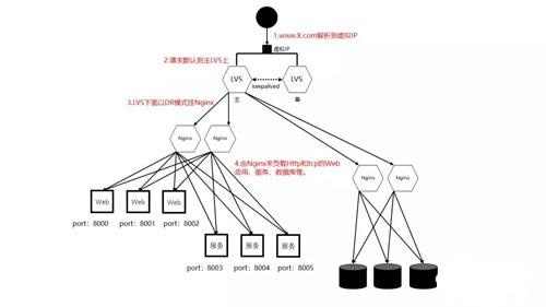 负载均衡这个领域还是以高可用和性能为两个最重要因素,下面是我推荐的一种组合方式,也是在系统量级达到每小时上亿 PV 之后最被广泛使用的一种。