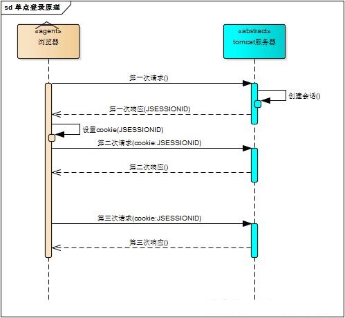 浏览器第一次请求服务器,服务器创建一个会话,并将会话的id作为响应的一部分发送给浏览器,浏览器存储会话id,并在后续第二次和第三次请求中带上会话id,服务器取得请求中的会话id就知道是不是同一个用户了,这个过程用下图说明,后续请求与第一次请求产生了关联