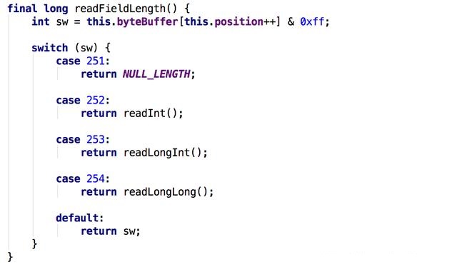 3.6、如果标志位是:252,代表需要2个字节代表字段的长度,此时加上标志位就是3个字节,在65536以内的长度的数据(64KB),注意,这里会在转成long的时候高位补0,所以2个字节可以填满到65536,只需要放大3个字节来表示这个数据。