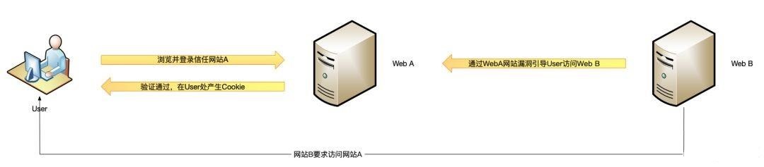 5.网站WebA接收到用户浏览器的请求,WebA无法分辨请求由何处发出,由于浏览器访问时带上用户的Cookie,因此WebA会响应浏览器的请求,如此一来,攻击网站WebB就达到了模拟用户操作的目的。